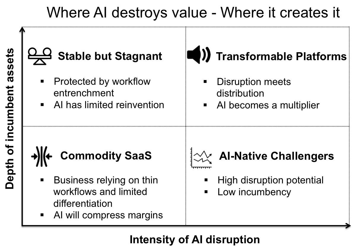 1. The intensity of AI disruption in its category: how much AI can fundamentally alter cost structures, user behavior, competitive dynamics.